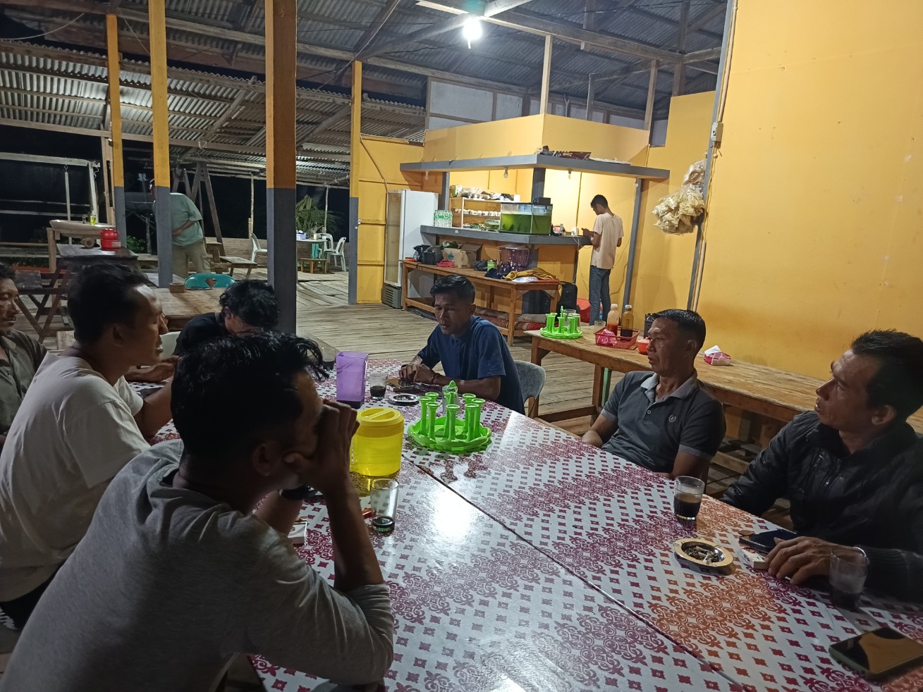 Sekdes Batu Berapit (baju biru) lakukan diskusi santai bersama Ketua BUMDes (baju putih) dan FK RT/RW di warung Erwansyah Padang Melang